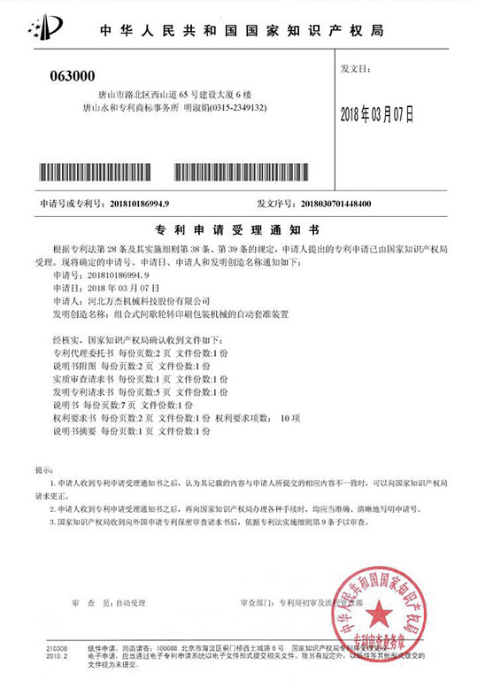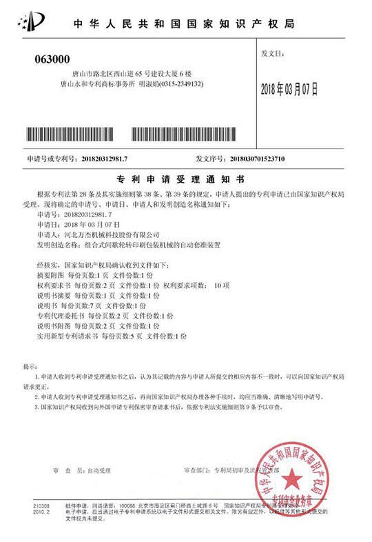 2018年3月07日,河北萬杰機械科技股份有限公司申請專利:組合式間歇輪轉(zhuǎn)印刷包裝機械的自動套準(zhǔn)裝置